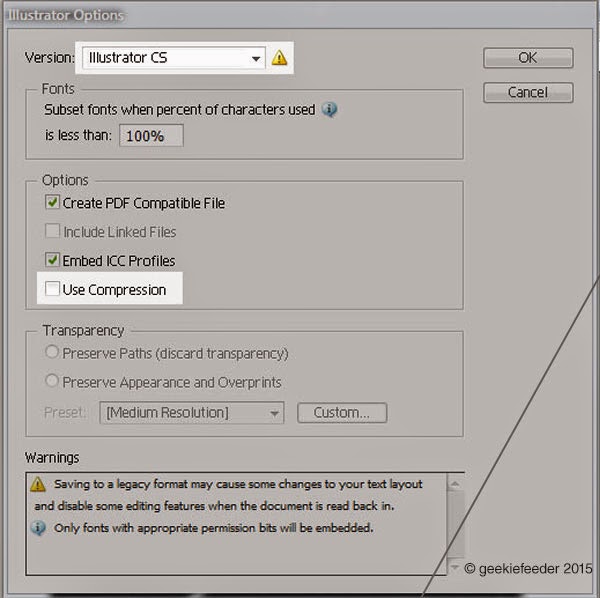 Simpan file ke versi Illustrator CS atau CS2 Mengapa? Karena ketika CorelDraw X3 dibuat, versi Adobe CS3 keatasnya belum ada. Juga jangan lupa untuk menonaktifkan "Use Compression". Tanya mengapa? Mungkin CorelDraw tidak paham dengan sistem kompresi Illustrator. Ya sudahlah... hehee. Bila sudah sip, tekan OK.